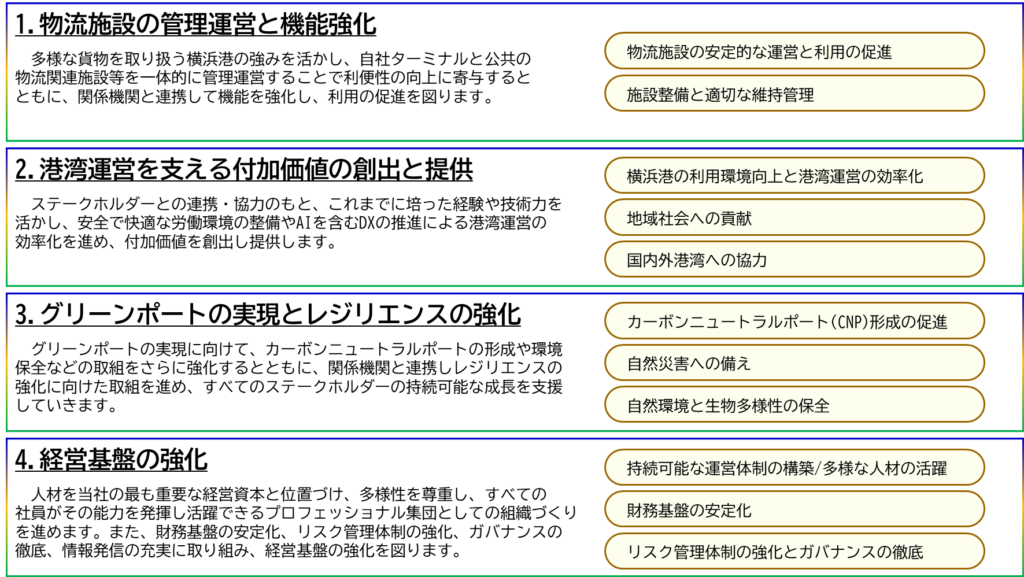 わたしたちは、横浜港を取り巻く環境や求められるニーズを踏まえ、企業理念及び経営方針のもと、中期経営計画(2026~2030年度)を策定しました。
