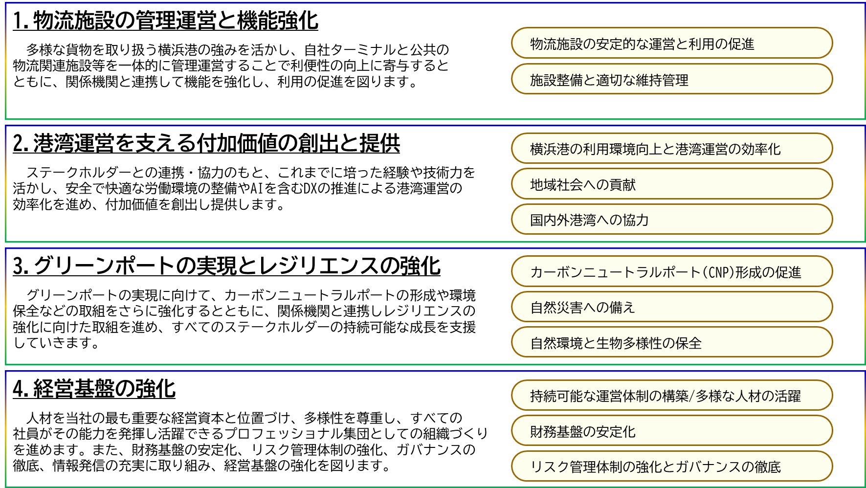 | 1 | 横浜港とともに | 1. わたしたちは、横浜港の機能強化を図り、国際海上貨物輸送網において、利便性、経済性に優れた、利用者に『選ばれる港づくり』をすすめます。 2. わたしたちは、優れた技術力の活用や質の高いサービスを提供し、国際的に信頼される『安全・安心で環境にやさしい港づくり』をすすめます。 3. わたしたちは、港湾関係者や国、港湾管理者と連携し、横浜港の総合力を高め、公正かつ透明な事業推進を図り、誰もが『使いやすい港づくり』をすすめます。 |